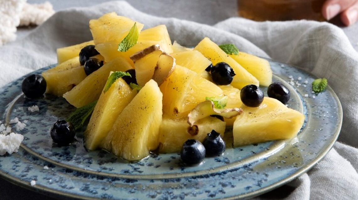 3 Sfornate l'ananas, fatelo riposare per 1 ora, poi rompete la crosta di sale. Estraete il frutto, sciacquatelo per eliminare ogni residuo di sale, asciugatelo, eliminate il ciuffo e fatelo raffreddare. Una volta freddo sbucciatelo e tagliatelo a pezzetti; mescolatelo coi mirtilli lavati e asciugati, copritelo con lo sciroppo e mettetelo in frigorifero per alcune ore. Servitelo freddo decorato con foglioline di menta.