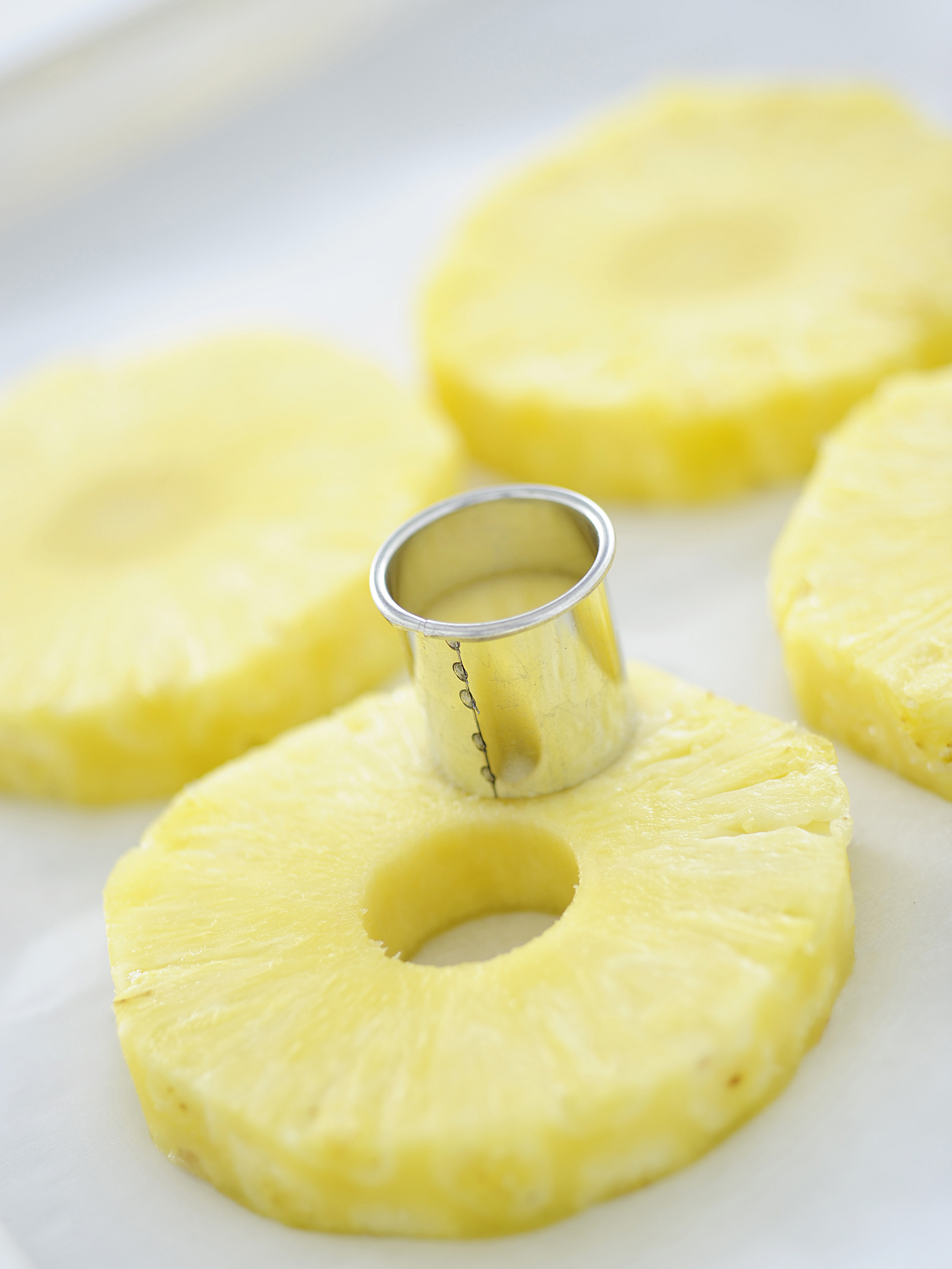 1) Inizia a lavorare alla ricetta dell’ananas nel cartoccio in pasta fillo dedicandoti alla pulizia del frutto. Elimina la buccia, il ciuffo e la base, poi riducilo in 6 fette di circa 2 centimetri l’una. Fai attenzione ad eliminare anche gli occhielli.