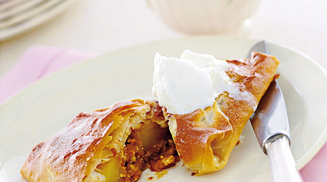 4) In una terrina monta la panna fino ad averla bene ferma, poi amalgamala con il fondo di cottura. Una volta che i dessert sono pronti, lasciali raffreddare, poi servi i cartocci di pasta fillo accompagnati da questo gustoso composto.
