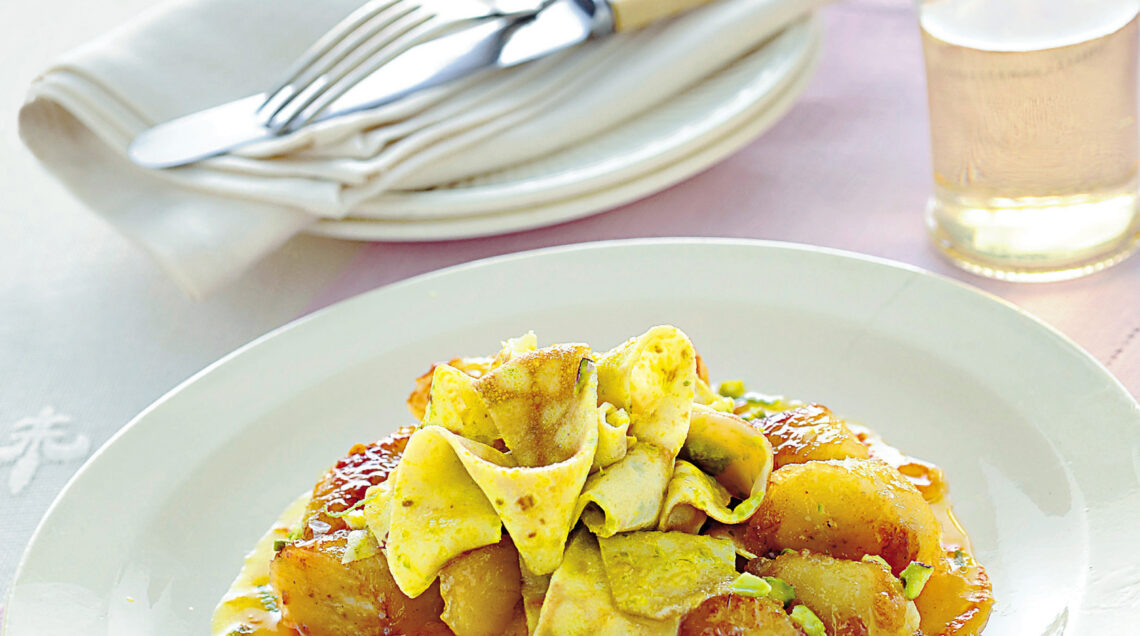 2) Scotta i pistacchi, sbucciali e tritali insieme allo zucchero. In una terrina sistema la farina, rompi le uova, aggiungi il latte, il burro fuso e 0,3 decilitri di acqua. Lavora gli ingredienti fino ad avere una pastella liscia e omogenea, poi lasciala riposare in frigorifero per circa 30 minuti.
