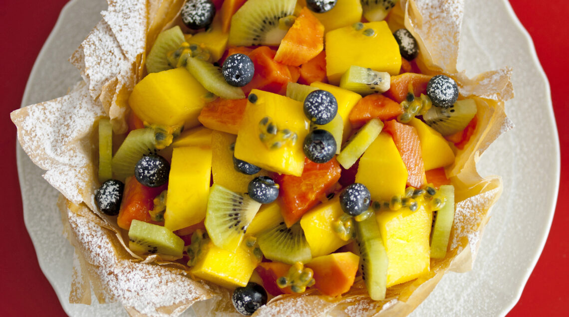 3) Una volta cotto, estrailo dal forno e lascialo raffreddare, poi copri il fondo con i savoiardi spezzettati e riempilo di macedonia di frutta. Aggiungi i semini dei frutti della passione tenuti da parte, cospargi il tutto con lo zucchero a velo e gusta subito il tuo cestino croccante con la macedonia di frutta.