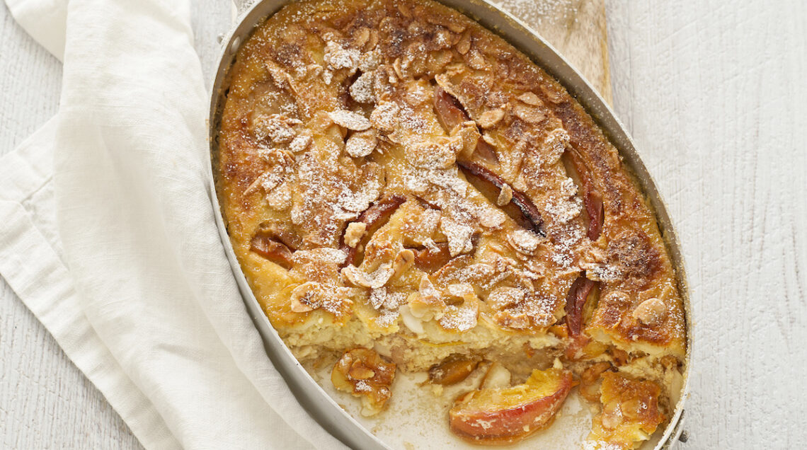 La variante del clafoutis alle pesche è preparata come nella ricetta originale con farina, mandorle, uova e zucchero, ma profumata con il moscato e lo zenzero. Per ottenere il raffinato dolce, preferite una pirofila in porcellana o in ceramica, poco porosa e quindi più adatta a non far attaccare la frutta al forno. Scegliete pesche mature, ma sode, nella varietà che preferite.