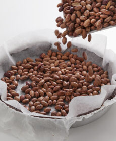 Setacciate la farina con il cacao e il lievito sulla spianatoia, aggiungete il burro morbido a pezzetti, lo zucchero, i tuorli, un pizzico di sale e impastate. Formate un panetto, avvolgetelo in pellicola e fatelo riposare per mezz'ora in frigo. Riprendete la pasta, stendetela con il matterello e mettetela in uno stampo da crostata di 24 cm di diametro foderato con carta da forno. Coprite il fondo con altra carta. Distribuite una manciata di legumi secchi e cuocete in forno già caldo a 170-180° per 25 minuti.
