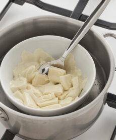 Spezzettate il cioccolato, fatelo sciogliere a bagnomaria, spegnete e fate raffreddare. Montate la panna con un cucchiaio colmo di zucchero a velo. Incorporate quindi la panna al cioccolato fuso con movimenti delicati dal basso verso l'alto.