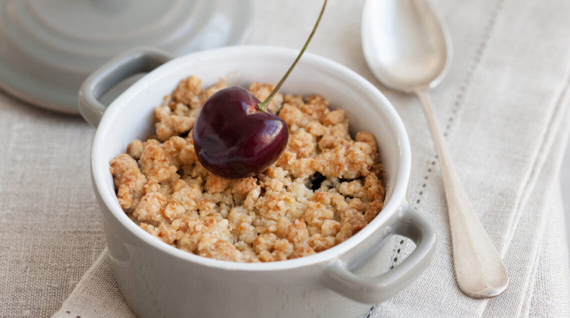 Dalla tradizione inglese, i crumble alla ciliegia uniscono la croccantezza del loro impasto con il gusto unico delle ciliegie