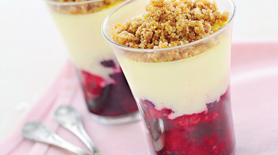 2) Lascia raffreddare i dolci ai frutti di bosco con formaggio e cospargi le briciole sui budini ormai freddi solo al momento di servire, in modo che rimangano croccanti.
