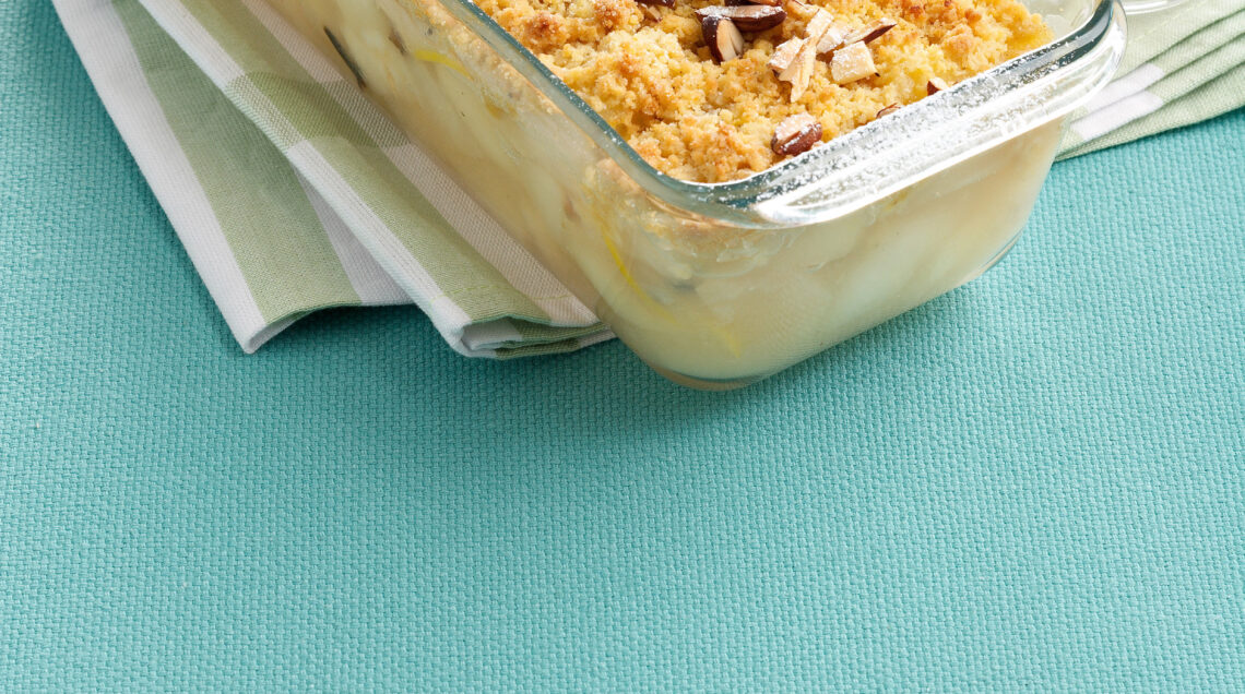1) Componi il dolce di pere disponendo la frutta cotta sul fondo di una teglia da forno o di una pirofila. Compatta le pere con il dorso di un cucchiaio, poi coprile con il composto di briciole. Metti a cuocere la teglia a 180° per 25 minuti. Dopo circa 15 minuti, trita grossolanamente le mandorle e distribuiscile in cima al dolce.
