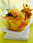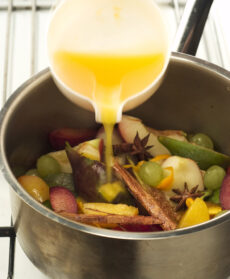 Per realizzare la profumata ricetta della frutta alle spezie, dedicati innanzitutto alla preparazione della frutta: taglia a spicchi 2 fichi, 2 prugne e 2 pesche, prendi una casseruola e mettili a bollire insieme a 12 acini di uva bianca, aromatizzati con 2 anici stellati, 2 pezzetti di cannella, 2 cucchiai di zucchero di canna, il succo di 2 arance e qualche scorzetta delle stesse.