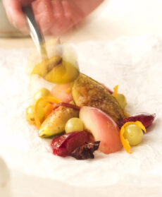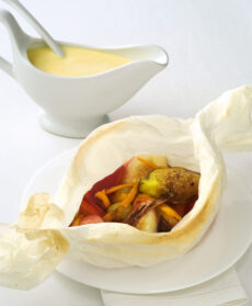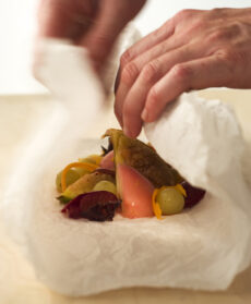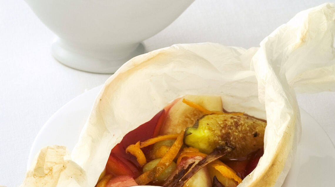 A questo punto lega le estremità dei cartocci a caramella. Prendi i cartocci, adagiali su di una placca da forno e cuocili a 200° per 10 minuti. Trascorso questo tempo, sforna, apri il cartoccio e trasformalo in una ciotolina. Servi subito la tua profumata e gustosa frutta alle spezie.