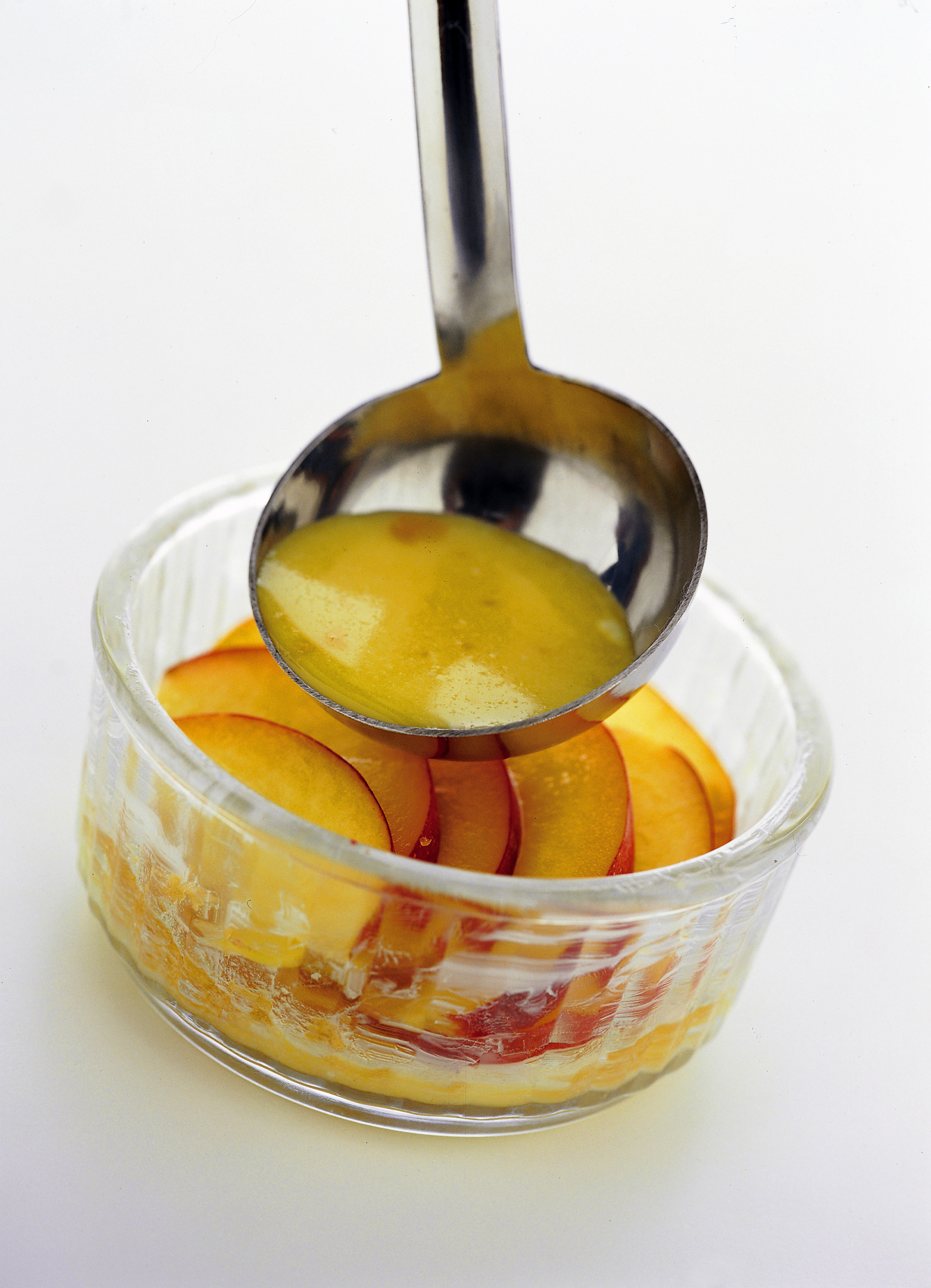 3) Versa al di sopra della sbriciolata di savoiardi un po' del composto a base di uova e metà delle fettine di pesca.