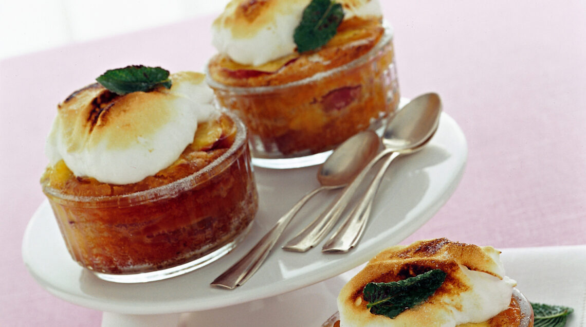 3) Rimuovi il foglio d'alluminio da sopra i gratin di pesche, suddividi la meringa sui 6 dessert e decora il tutto con qualche fogliolina di menta fresca; cospargi le pirofile monoporzione con lo zucchero rimasto e termina la cottura gratinando in forno per qualche minuto.