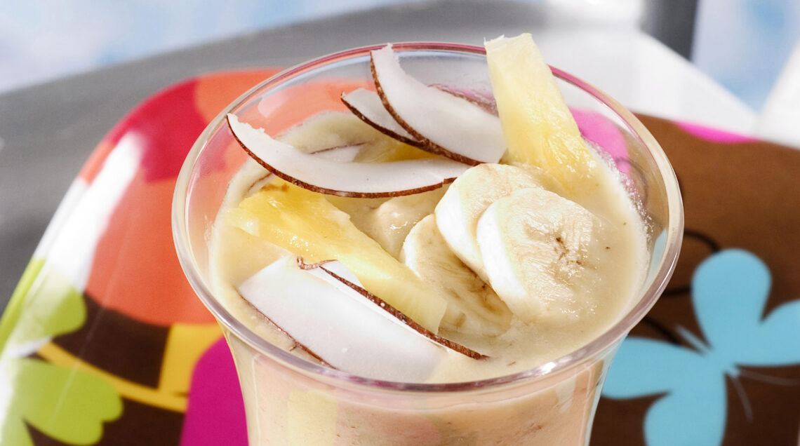 3) Nel bicchiere del frullatore metti altre 2 banane a pezzi, insieme a 250 grammi di polpa, altri 50 grammi di cocco fresco. Aggiungi 2 cucchiai di zucchero, 2 decilitri di yogurt magro e infine 2,5 decilitri di acqua: mixa alla massima potenza disponibile nell’apparecchio per massimo 2 minuti.
