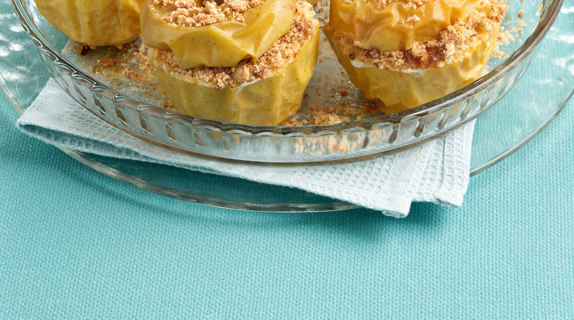 5) In un'altra teglia, foderata con un foglio di carta da forno, metti le calotte delle mele con la parte tagliata verso il basso, cospargile con le briciole rimaste e cuocile in forno per 10 minuti. Poi ricomponi i frutti e servi il dessert caldo.