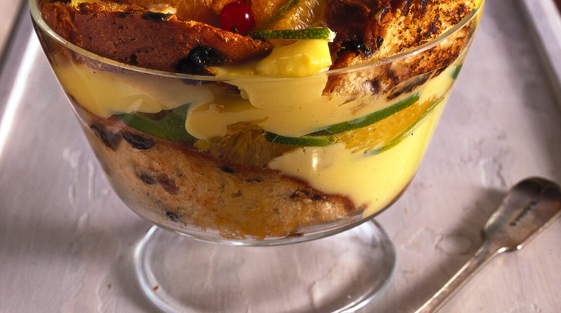 5) Pela al vivo gli agrumi e poi anche gli spicchi e conserva qualche scorzetta privata della pellicina bianca. In una grossa coppa di vetro comincia a disporre a strati il panettone, la crema, gli spicchi e le scorze d'agrumi e prosegui così fino a esaurire tutti gli ingredienti. Decora con chicchi di ribes e conserva in frigorifero almeno per un'ora. Servi spolverizzando con zucchero a velo.