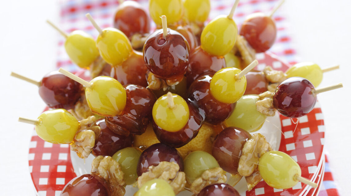 1  Lavate, sgranate e asciugate i grappoli d'uva, bianca e rosata. Infilate gli acini su spiedini di legno, alternandoli con circa i gherigli di noce. Versate in una pentola lo zucchero con 4-5 cucchiai di acqua e 4-5 gocce di succo di limone.