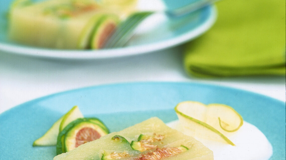 3) Nel frattempo taglia a fette i fichi e sminuzza i gherigli di noci. Estrai lo stampo dal frigo e prosegui disponendo uno strato di fichi e gherigli. Prosegui alternando gli strati fino a riempire lo stampo. Lascia riposare la terrina in frigorifero almeno per 6 ore.