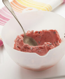 Fate il secondo strato. Lavorate il gelato alla vaniglia per pochi istanti con un cucchiaio, poi stendetene uno strato uniforme sul gelato al pistacchio. Rimettete nel congelatore per 30 minuti.