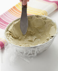 Mettete nel freezer una ciotola semisferica della capacità di 1,2 -1,5 litri oppure una pirofila ovale a bordi alti (10-12 cm). Quando sarà ben fredda fasciatela con pellicola trasparente e foderate il fondo e le pareti con il gelato al pistacchio, formando uno strato di circa 1 cm di spessore. Livellatelo con una spatola bagnata in acqua tiepida. Rimettete la ciotola in freezer per 1 ora.