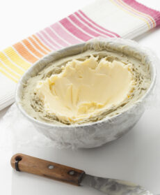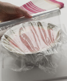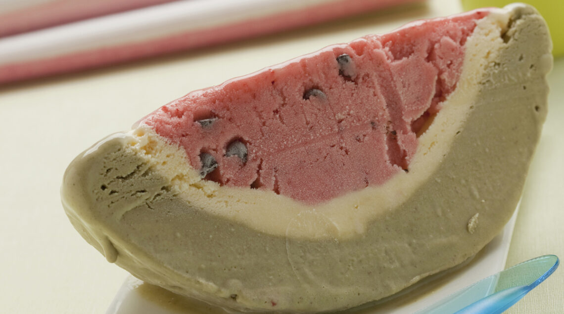 Capovolgete il gelato su un vassoio, eliminate la pellicola e tagliatelo a spicchi, come se doveste suddividere una mezza anguria. Servitelo su piattini.
