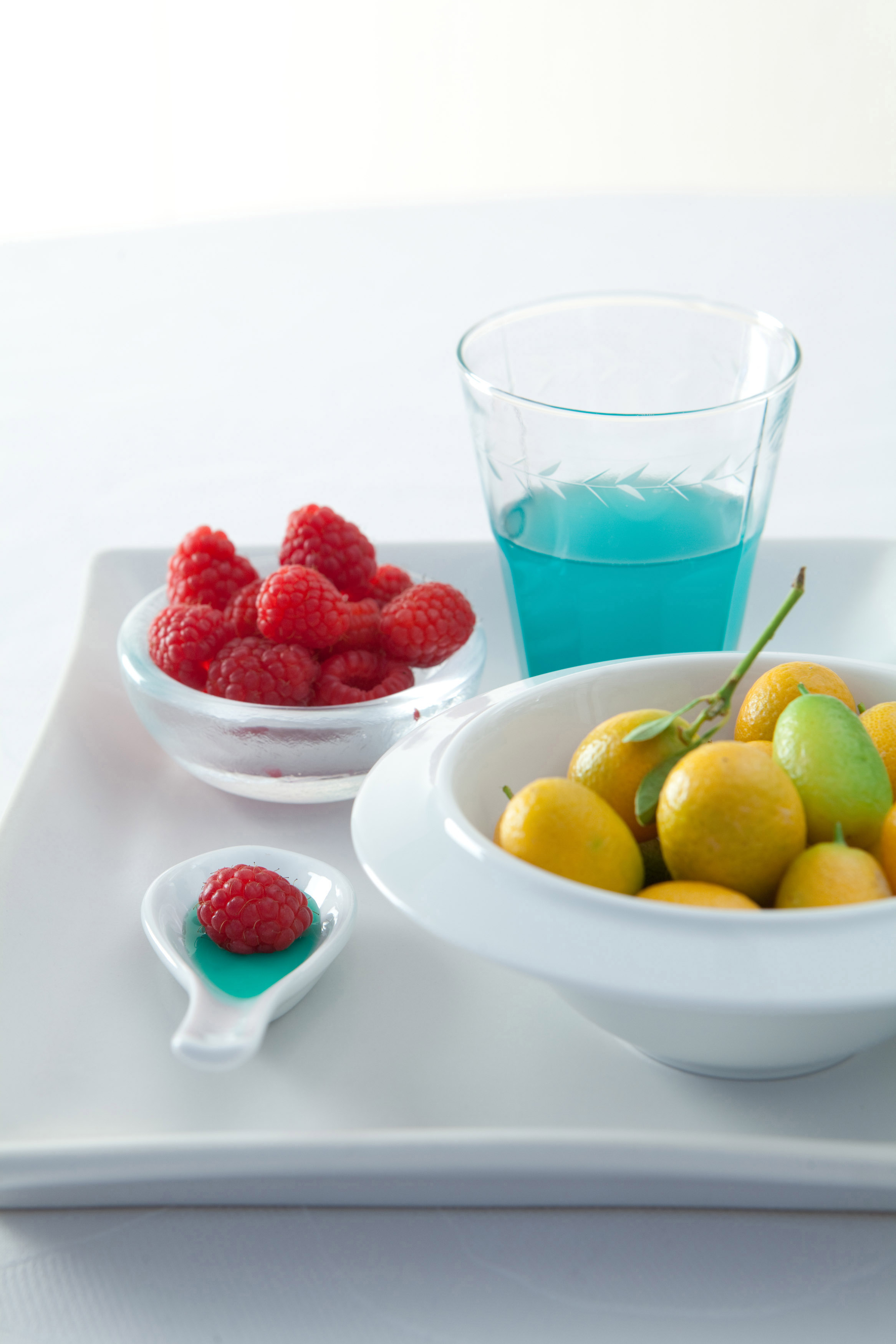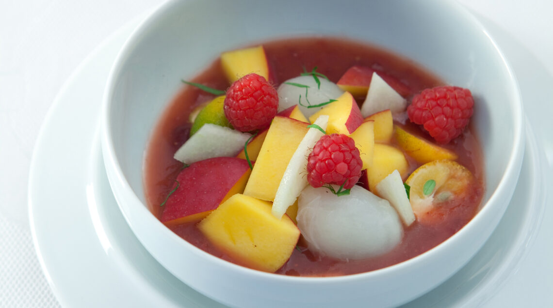 4) Questa non è la classica macedonia, infatti oltre alla salsa di lamponi è composta da ingredienti meno tipici quali mango e kumquat che ne rinnovano il gusto esaltando i sapori assieme all’inebriante e fresco profumo delle foglie di menta. Questa golosa macedonia in salsa di lamponi e alchermes è il giusto dessert gustoso per completare il pasto con dolce freschezza.
