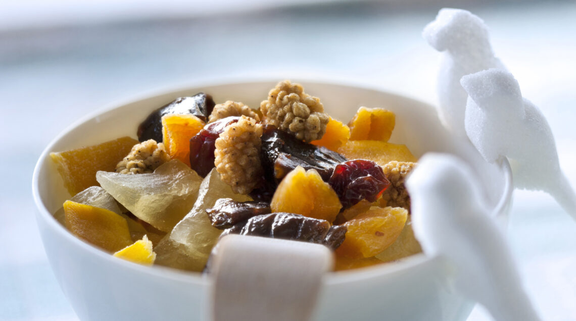 1 Tagliate a pezzettini la frutta disidratata mista (ananas, albicocche, prugne, more di gelso, mango). Scaldate 4 tazze di acqua e, prima che raggiunga il bollore, versatela sul tè bianco: lasciate in infusione per 3-4 minuti, poi filtrate.