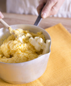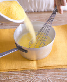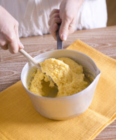 Cuocete la polenta per 10 minuti mescolando spesso con un cucchiaio di legno perché non si attacchi sul fondo della casseruola. Spegnete il fuoco.