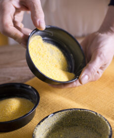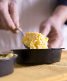 Imburrate 6 stampi rotondi del diametro di 8 cm, rivestite il fondo e i bordi con la farina di mais.