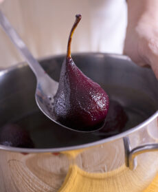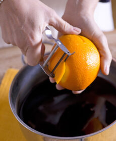 Nel frattempo, versate il vino in una casseruola con lo zucchero rimasto, la scorza dell'arancia prelevata con un pelapatate e i chiodi di garofano; portate a ebollizione. Unite le pere sbucciate e cuocetele per circa 30 minuti.