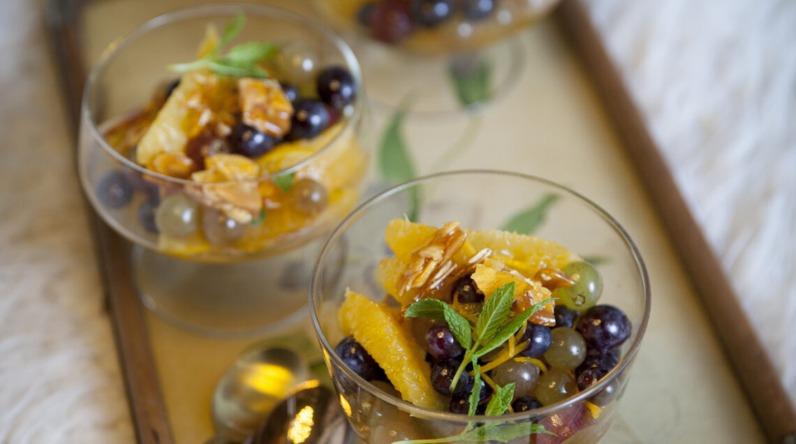 3) In una ciotola mescolate gli spicchi di arancia e i chicchi d'uva, versatevi sopra lo sciroppo e lasciate riposare per 1 ora. Servite la macedonia con il croccante rimasto a pezzetti.