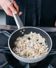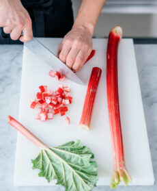 2) Tostate le mandorle in un padellino. Pulite il rabarbaro e riducetelo a dadini.