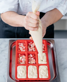 3) Distribuite le mandorle in 12 cavità di uno o più stampi multipli a lingotti. Quindi unite metà dell'impasto, poi il rabarbaro e infine l'impasto rimasto. Cuocete in forno caldo a 160° per 7 minuti.