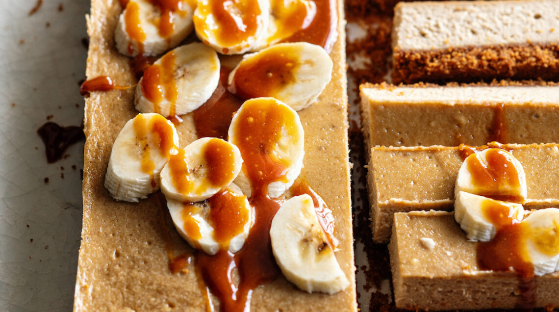 1) Preparazione della mattonella alla banana. Scaldate il forno a 155°. Per la base: tritate i biscotti finemente e mescolateli con il burro fuso e un pizzico di sale fino a ottenere un composto a briciole. Distribuitelo sul fondo di uno stampo rettangolare da 20x25 cm, con il fondo rivestito con un foglio di carta forno e il bordo imburrato e trasferite in frigo per 20 minuti.