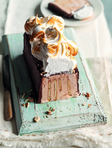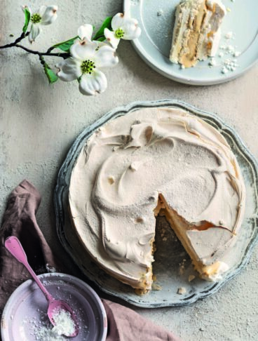 1 Preparate la meringa francese: versate gli albumi in una grossa ciotola (o nella planetaria) con 80 g di zucchero e iniziate a montare con le fruste alla velocità minima, tenendole inclinate per far incorporare al composto quanta più aria possibile. Quando il composto risulterà ben montato, aggiungete lo zucchero rimasto gradualmente, aumentando la velocità delle fruste e continuando a montare fino a ottenere una meringa ben soda e lucida.