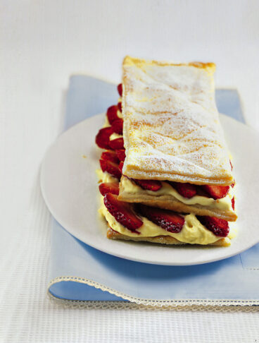 1 Srotolate la pasta sfoglia, appoggiatela sopra una placca rivestita di carta forno, coprite con un altro foglio di carta e una placca identica e cuocete in forno a 200° per 18-20 minuti. Scoprite la pasta, cuocetela ancora 3 minuti quindi spolverizzatela con uno strato uniforme di zucchero a velo e passatela sotto il grill per farlo caramellare (controllatela a vista per non farlo bruciare). Fate raffreddare. Quindi tagliate la pasta in 2 rettangoli grandi (lunghi e stretti) poi in 12 rettangoli piccoli tutti uguali. Tenete da parte.