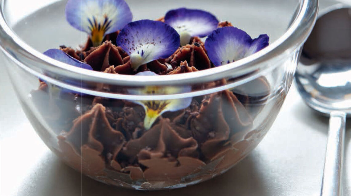 Un dolce al cucchiaio vegano, realizzato senza fuoco che valorizza il sapere della cucina crudista, scegliendo prodotti di altissima qualità e freschezza, come l'avocado, gli anacardi, il cacao. Sapiente anche l'uso delle spezie, vaniglia, cannella e noce moscata. Un dessert voluttuso, decorato con fiori freschi.