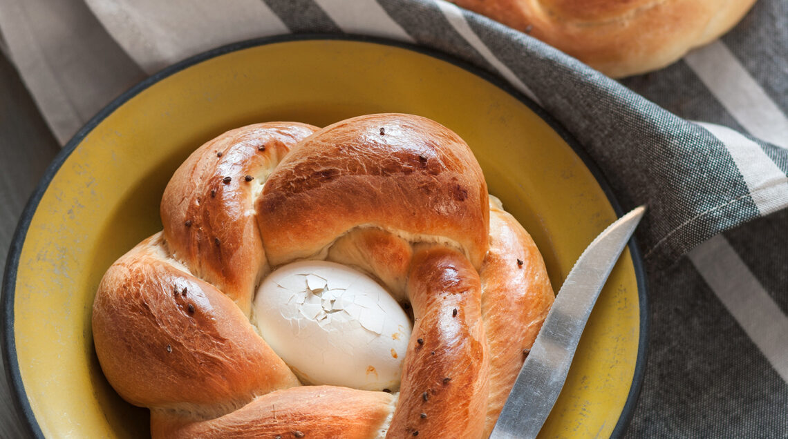 3 Sistemate le ciambelle sulla placca foderata con carta da forno, mettete un uovo lavato al centro di ognuna e fate lievitare ancora per mezz'ora in un luogo tiepido. Spennellate la superficie con un po' di tuorlo sbattuto con poca acqua e un pizzico di sale e mettete in forno caldo a 180° per 25 minuti. Lasciate raffreddare completamente e servite.