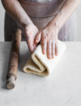 2) Arrotolate la pasta verso il centro a partire dai entrambi lati lunghi, facendo in modo che i 2 rotolini si tocchino in mezzo. Coprite con pellicola e passate in freezer per 15 minuti, per facilitare il taglio.
