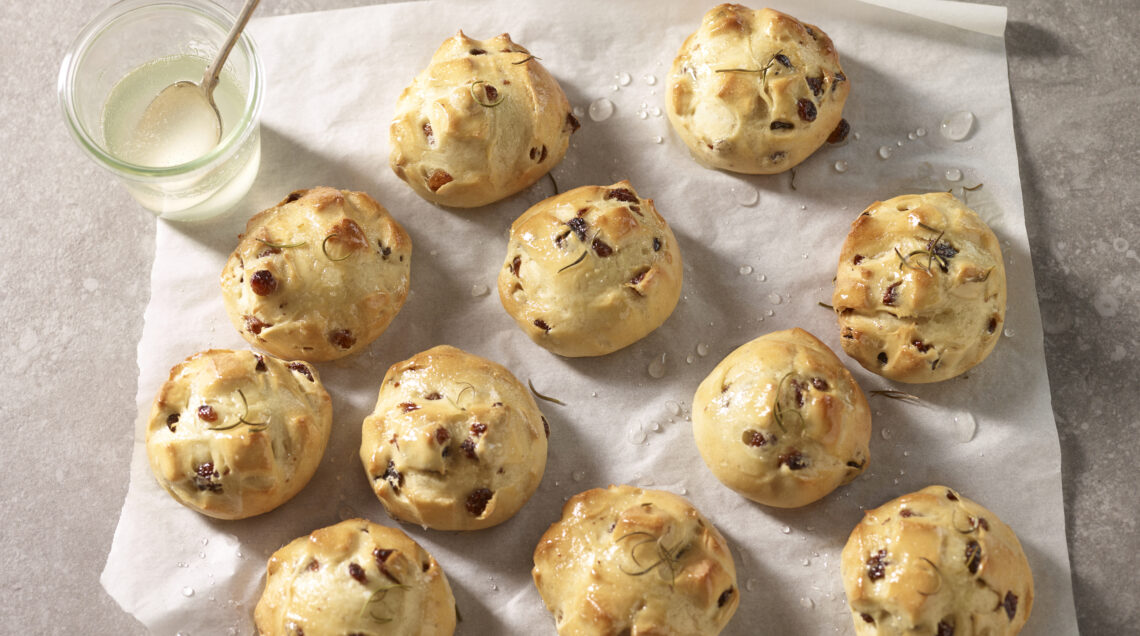 4 Trasferitele su 2 teglie rivestite con carta da forno, incidetele con tagli a croce e lasciatele lievitare coperte per 40 minuti. Cospargetele con il rosmarino rimasto e cuocetele in forno già caldo a 180° per circa 30 minuti. Intanto, versate lo zucchero e 1 dl di acqua in un pentolino, fate bollire, spegnete, fate raffreddare e spennellate i pani appena sfornati.
