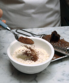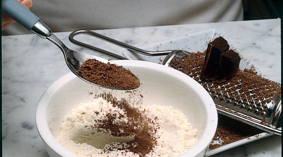 Raccogliete in una terrina la farina e il cioccolato fondente grattugiato; aggiungete un pizzico di vanillina e lo zucchero semolato e mescolate bene.