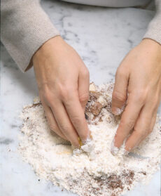 Trasferite tutto sulla spianatoia, fate la fontana, mettete al centro il burro a pezzetti, l'uovo intero e il tuorlo e impastate procedendo come per la pasta base.