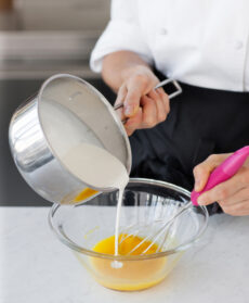 Preparate la crema inglese: sbattete i tuorli in una ciotola con 35 g di zucchero e nel frattempo scaldate la panna a bagnomaria fino a quando raggiunge la temperatura di 80°. Trasferite il mix di tuorli in un pentolino, versatevi sopra la panna e cuocete a fuoco basso finché la crema arriva vicino all'ebollizione (a 86°).