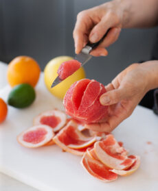 Preparate gli agrumi zuccherati: pelate i frutti a vivo, cioè tagliate tutta la scorza con la lama di un coltello affilato arrivando fino alla polpa; eliminate anche le pellicine, incidete gli spicchi per separarli ed estraeteli con molta delicatezza. Metteteli su un vassoio foderato con alcuni fogli di carta da cucina, in modo che assorbano parte del succo. Poco prima di servire, prendete uno spicchio d'agrume alla volta e passatelo nello zucchero semolato rimasto, in modo da ricoprirlo interamente. Al momento di servire, distribuite la crema inglese al centro di ogni piatto, sistematevi sopra un babà e su questo distribuite gli spicchi degli agrumi zuccherati a ventaglio. Completate con i pinoli e, se vi piace, con una fogliolina d'erba limoncina o con un alchechengi.