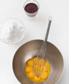 Preriscalda il forno a 130° e mettilo sulla funzione ventilato (se questa funzione non è presente, puoi utilizzare il forno statico ma a una temperatura di 140°). Disponi i tuorli nella planetaria e montali con la frusta a mano o elettrica per almeno 10 minuti finché saranno densi, chiari e spumosi.