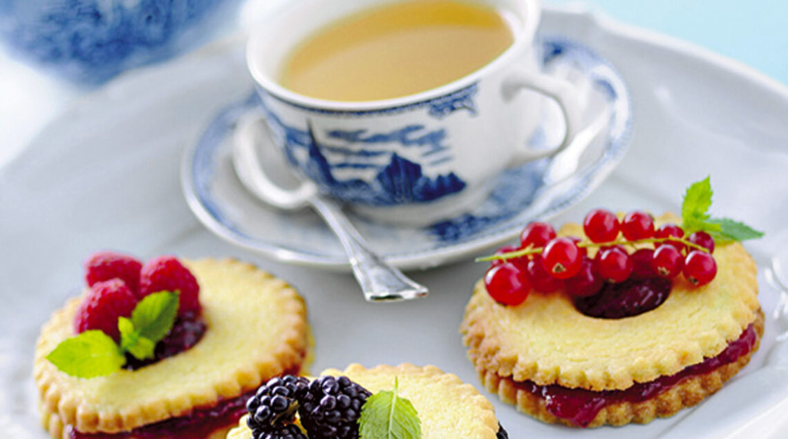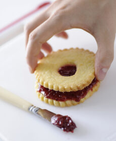 Sistemate i biscotti su una placca foderata di carta da forno e cuoceteli nel forno caldo a 180° per 10 minuti abbondanti, poi sfornateli e lasciateli raffreddare. Spalmate i biscotti senza foro con le confetture scelte, disponetevi sopra i biscotti forati, decorate con i frutti da abbinare alla confettura e servite.