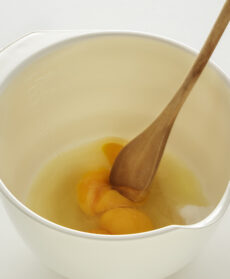Sgusciate le uova intere, facendole cadere in una ciotola a bordi alti, aggiungete il tuorlo, lo zucchero e un pizzico di sale. Montate il composto fino a renderlo chiaro e spumoso.