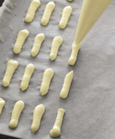 Trasferite il composto preparato in una tasca da pasticciere con bocchetta liscia e larga e, premendo leggermente, fate cadere sulla placca foderata con carta forno bagnata e strizzata tanti cilindri di circa 8 cm di lunghezza. Cuocete i biscotti in forno caldo a 180° per circa 15 minuti, finché saranno leggermente dorati e gonfi. Sfornateli, trasferiteli su una gratella e lasciateli raffreddare prima di gustarli.
