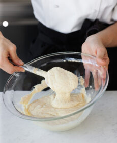 Montate i tuorli e 110 g di zucchero con le fruste, poi montate anche gli albumi a neve con lo zucchero rimasto, aggiungeteli ai tuorli e incorporate anche la farina 00 e quella di nocciole. Sciogliete il burro a bagnomaria e mettetelo in una ciotola, incorporate l'impasto poco alla volta. Trasferitelo in uno stampo rettangolare e cuocete in forno a 170° per 20 minuti.