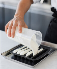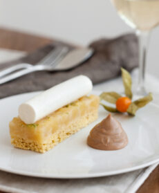Nel latte caldo, mettete la gelatina ammorbidita in acqua, fatela sciogliere, emulsionate il latte gelatinato ancora caldo al cioccolato a cubetti che si scioglierà. Lasciate raffreddare finché diventerà tiepido e poi incorporate la panna. Sistemate i rettangoli di biscotto con la composta di mele sui piatti individuali con i ghiaccioli di meringa e, con una tasca da pasticciere, completate ogni piatto con la salsa gianduia e gli alchechengi.