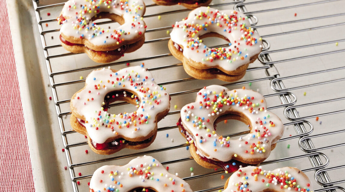 1) Per realizzare la ricetta ciambelline glassate procedi stendendo su una spianatoia leggermente infarinata 200 g di pasta frolla. Lavorala con il mattarello fino ad ottenere una sfoglia abbastanza sottile. Con l’aiuto di un coppapasta, delle formine per dolci o di un bicchiere, ritagliala ricavandone delle ciambelline. Verifica che siano in numero pari, poi stendi un velo di confettura di albicocche su metà di esse e accoppiale con l’altra metà.