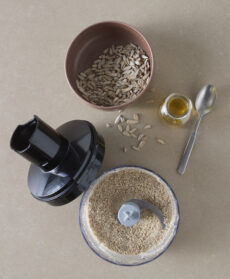 Tritate finemente i semi di girasole nel mixer, trasferiteli in una ciotola con il ghee e lo zucchero, sbattete gli ingredienti con le fruste elettriche a bassa velocità fino ad avere una consistenza cremosa.